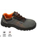 Calzatura in pelle scamosciata forata colore grigio, cuciture di colore arancio, fodera interna di colore arancio, linguetta imbottita, puntale in composito, lamina in acciaio, soletta estraibile traspirante e antistatica, suola in poliuretano bidensità